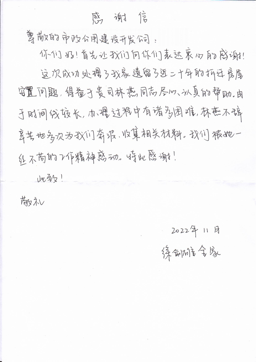 11月23日上午,剛住進(jìn)新房的羅女士為城發(fā)集團(tuán)所屬市政公用公司特意送來(lái)錦旗和感謝信,感謝公司在他們家庭的遺留拆遷安置問(wèn)題中的不懈付出和努力。